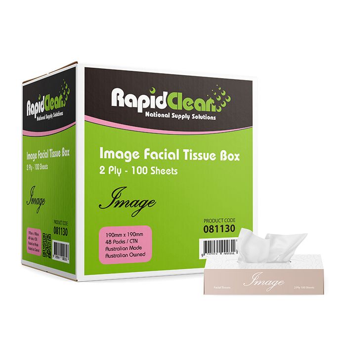 2 Ply, 100 sheets – 205mm x 195mm sheet – 48 Packs per carton RapidClean Image Facial Tissue Box 100 Sheets are ideal for use in all areas. The compact box design ensures that RapidClean Image Facial Tissue Box 100 Sheets fit easily on your office.