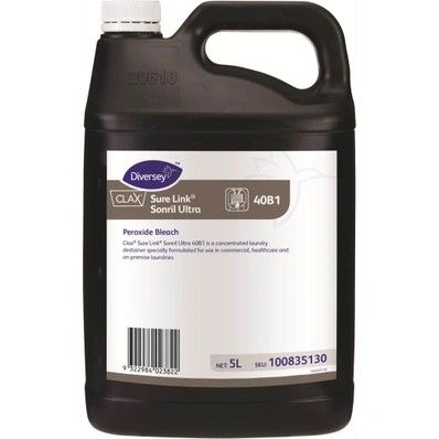 The DIVERSEY SURELINK CLAX SONRIL ULTRA 40B1 DESTAINER 5L is a powerful laundry destainer designed for use in commercial, healthcare, and on-premise laundries. This concentrated product is effective on all types of fabric, except nylon, and should be applied in the main wash at temperatures between 70°C and 90°C. It is ideal for removing tough stains and ensuring clean and fresh laundry.