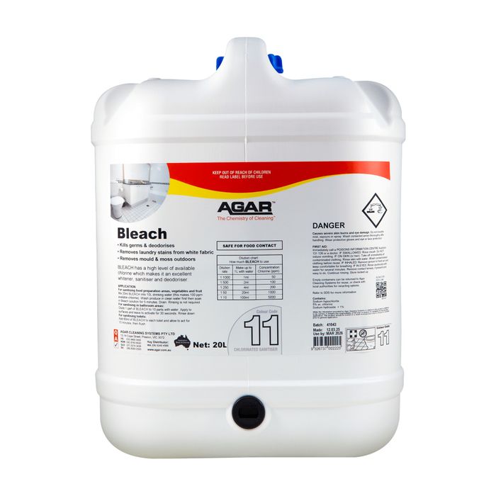 AGAR BLEACH 20L is a solution of sodium hypochlorite in water, containing 5% available chlorine when packed, making it an excellent sanitiser due to its highly effective ability to kill undesirable micro-organisms such as germs and bacteria. Additionally, its powerful stain-destroying properties make it a useful whitening agent in laundry applications.