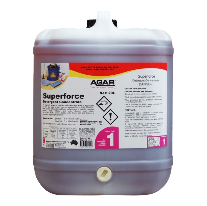 Tackle tough messes with Agar Superforce. This concentrated, heavy-duty cleaner and deodorizer cuts through dirt, grease, grime, and even carbon and smoke deposits. Safe for use on a wide range of surfaces, including floors, tiles, walls, upholstery, and more. Experience powerful cleaning without the hassle.
