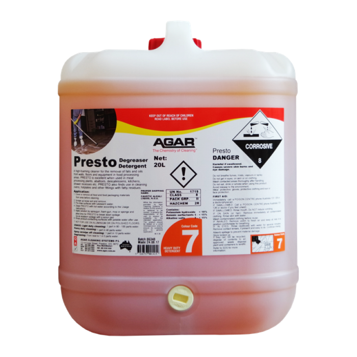 Agar PRESTO is a high-foaming cleaner for the removal of fats and oils from walls, floors, and equipment in food processing areas.
