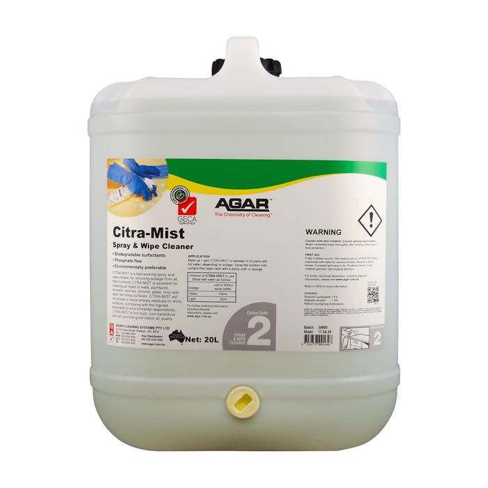 AGAR CITRA-MIST SPRAY & WIPE CLEANER 20L is an environmentally preferable cleaning solution designed for all hard surfaces. Its effective formula provides a quick and easy clean, making it ideal for a wide range of applications.