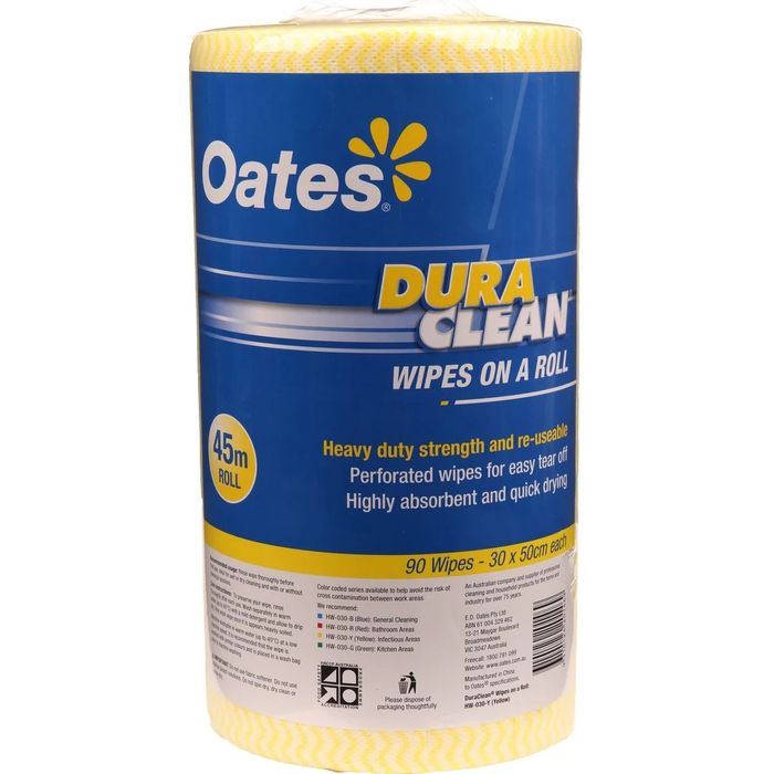 The Oates DuraClean Wipes on a Roll Yellow are a heavy-duty cleaning solution designed to tackle tough cleaning tasks. These industrial-strength wipes are highly absorbent and quick-drying, making them ideal for various cleaning applications. The perforated roll design ensures easy tear-off and efficient use.