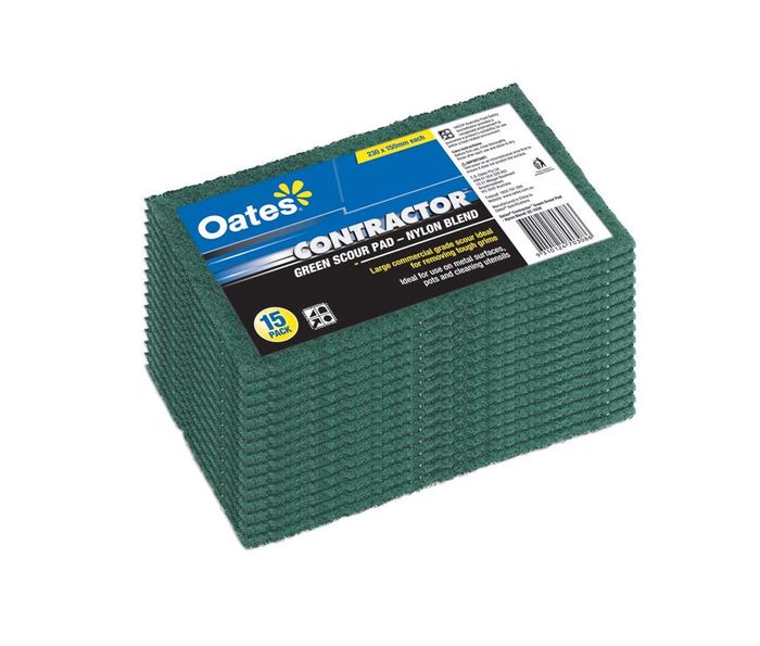 Tackle tough grime with Oates Contractor Scour Pads. These commercial-grade green scourers are designed to handle the toughest cleaning jobs in kitchens and beyond. Perfect for removing baked-on food, grease, and other stubborn residues from pots, pans, and utensils. Packet of 15 Green Pads. SC-103V