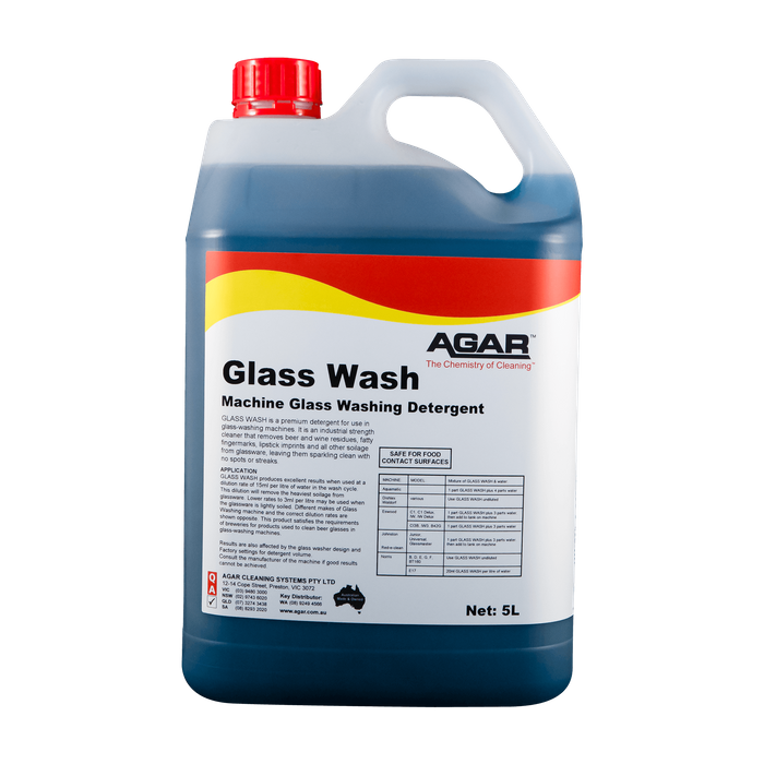 Agar GLASS WASH is a premium, industrial-strength detergent specifically formulated for glass-washing machines. It effectively eliminates residues and soilage from glassware, ensuring a spot-free and streak-free finish. This powerful cleaner effortlessly removes beer and wine residues, greasy fingerprints, lipstick marks, and all other types of grime, leaving your glassware sparkling. Notably, GLASS WASH maintains its high performance even in hard water conditions.