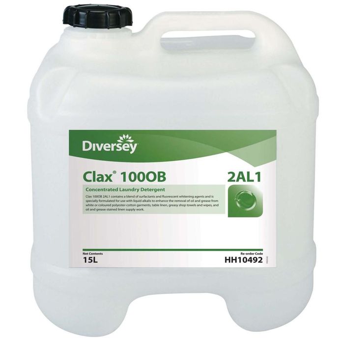 CLAX 100B 2AL1 15L by Diversey is a liquid detergent booster based on a blend of surfactants and containing an optical brightener
