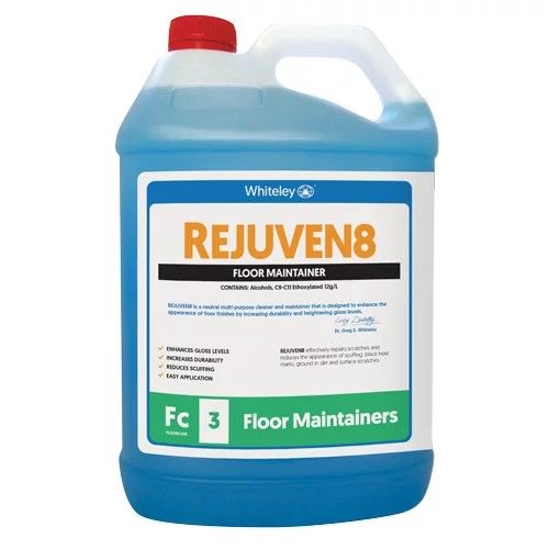 WHITELEY Rejuven8 5L is a neutral, multi-purpose cleaner and maintainer that revitalizes worn floor finishes. This next-generation formula enhances gloss, increases durability, and effectively repairs scratches and scuffs, restoring floors to a like-new appearance.