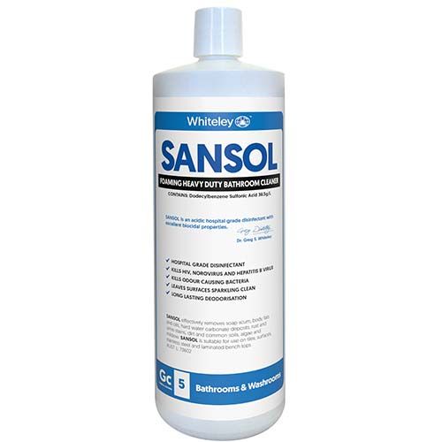 Whiteley Sansol is a powerful, heavy-duty bathroom and disinfectant cleaner designed for use in public bathrooms and washrooms. It effectively removes soap scum, body fats, and oils, and is proven to kill HIV, Hepatitis B, and Norovirus. Sansol is a concentrated formula that provides rapid cleaning and disinfection power for high-traffic areas.