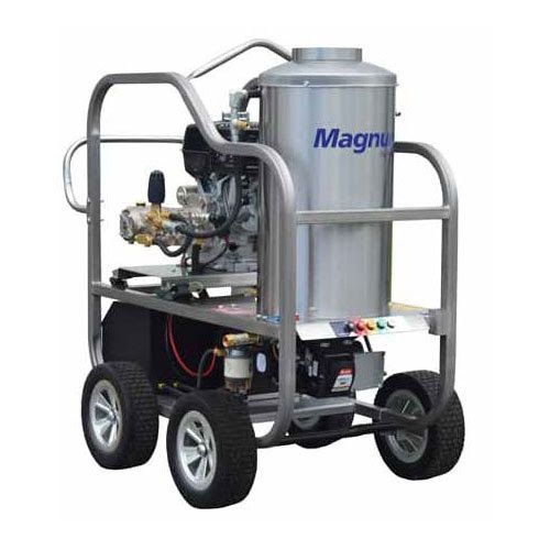 The Pro Super Series Four Wheel Magnum is a mobile hot water pressure cleaner with heavy duty brass pump and ceramic pistons, powered by a Honda GX390 motor with electric start. The triple belt drive system results in balance transfer for high efficiency and output. The heavy duty protective frame is a rugged stainless steel roll cage with lifting hook and flat-free tyres with threaded axels for easy transport and portability. Vibration dampeners provide less wear and tear on other components. Featuring a super efficient insulated schedule 80 coil - the coil design utilises robotic welding for consistent flow and heat rise. Regulated by burner control box, adjustable thermostat and high limit over temp protection. Other features include safety pressure release valve, reliable beckett burners, stainless steel coil wrap, and premium poly diesel fuel tank with fuel filter, all backed with a one year commercial warranty. • Heavy duty brass pump with ceramic pistons • Honda GX390