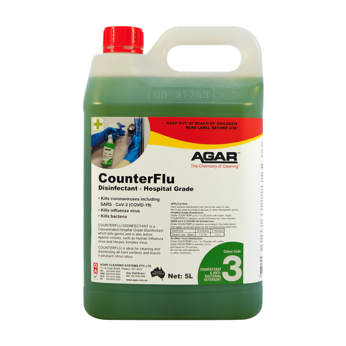 Agar COUNTERFLU is a hospital-grade disinfectant with a powerful cleaning action that kills viruses including COVID-19 virus and flu virus, germs, bacteria, fungi and moulds. It leaves any hard surface clean, disinfected, and perfumed with a long-lasting citrus fragrance.