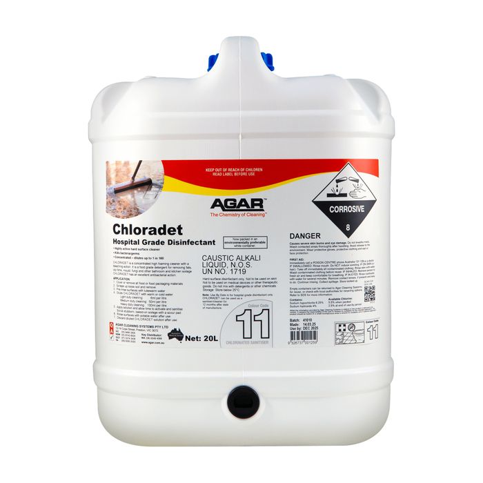 AGAR CHLORADET DISINFECTANT 20L is a concentrated, high-foaming cleaner that incorporates a powerful bleaching action. Its exceptional ability to eliminate undesirable microorganisms such as germs, bacteria, and fungi makes CHLORADET an outstanding sanitiser.