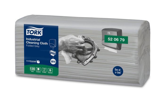 Tork Industrial Cleaning Cloths are robust, folded grey, 1-ply cloths, supplied in packs of 120 (4 packs per carton, W4 system). These cloths are designed for heavy-duty cleaning tasks in industrial environments.