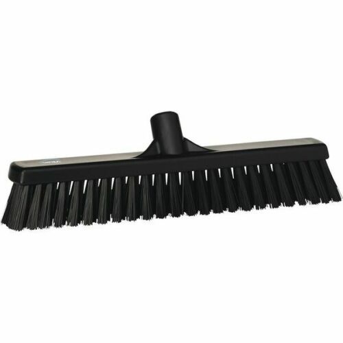 VIKAN SWEEPING BLACK FLOOR BROOM - 420MM This sweeping broom has two types of bristles. When pushing the broom forward the front rows, which have firm bristles, loosen the dirt and push heavier debris. The softer bristles of the back rows, gather the finer particles.