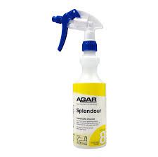 SPLENDOUR is a lightly perfumed, silicone and wax-based polish which cleans and shines all polished wood, rubber, plastic, metal and ceramic surfaces that are not water-sensitive. Agar Screen Printed 500ml Bottle Only