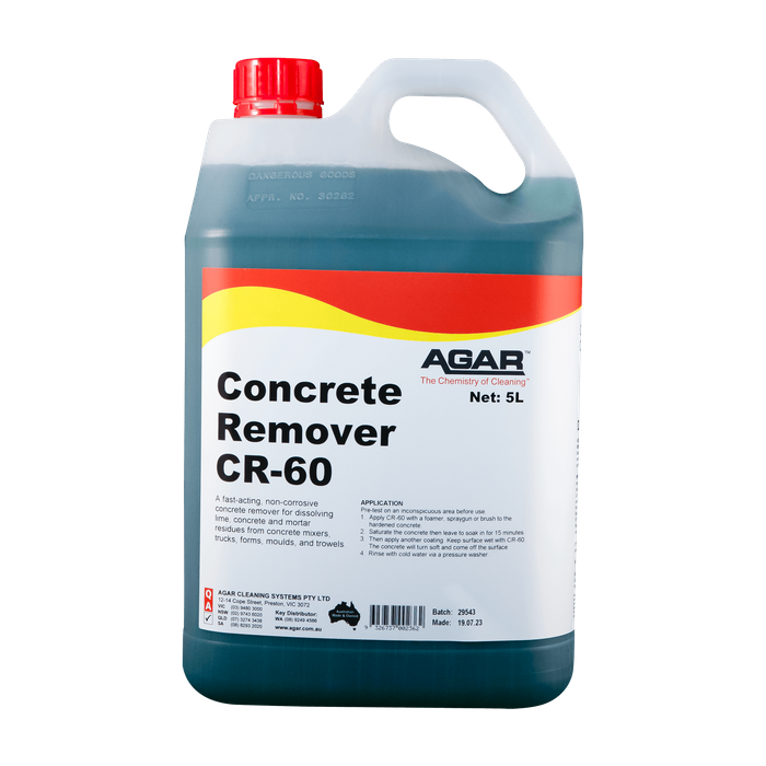 Agar Concrete Remover CR-60 is a rapid-acting, non-toxic solution for removing concrete, lime, and mortar residue. Ideal for cleaning concrete mixers, trucks, trowels, and other surfaces exposed to concrete.