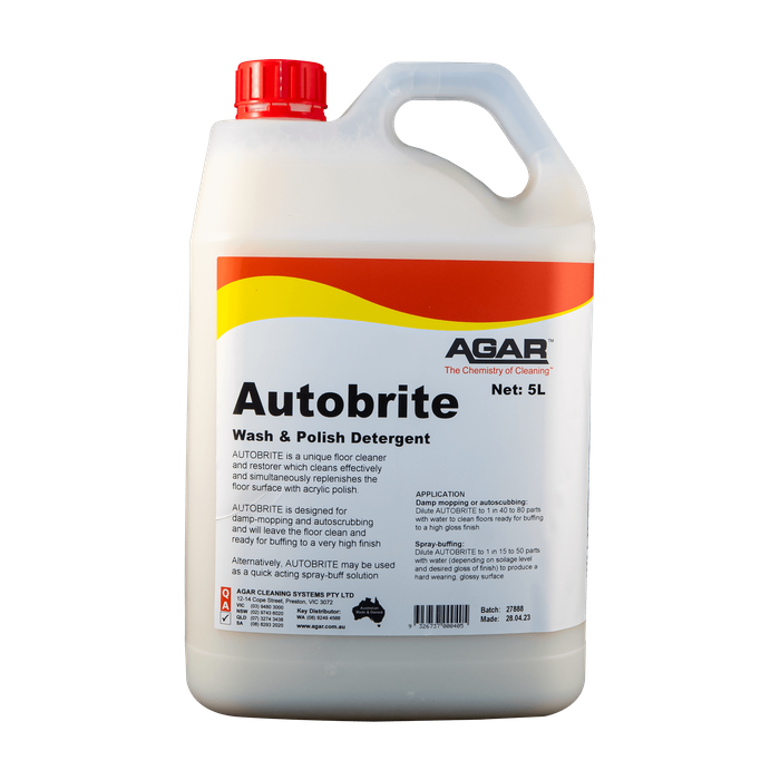 Agar AutoBrite Wash & Polish Detergent is a unique floor cleaner and restorer that effectively cleans while simultaneously replenishing the floor surface with acrylic polish. Designed for damp-mopping and autoscrubbing, it leaves the floor clean and prepared for buffing to a very high finish, or it can be utilized as a quick-acting spray-buff solution.